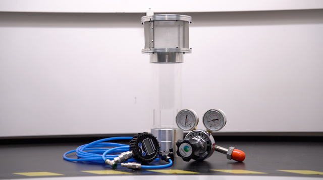 We take a standard ejector made to the specifications in ASHRAE 110-2016. We replace the dial gauge and replace it with a digital PSI gauge. We then use a special mass flow sensor that is made specifically for SF6 to adjust the pressure to get exactly 4.0 LPM. We then record the pressure on the digital PSI meter.